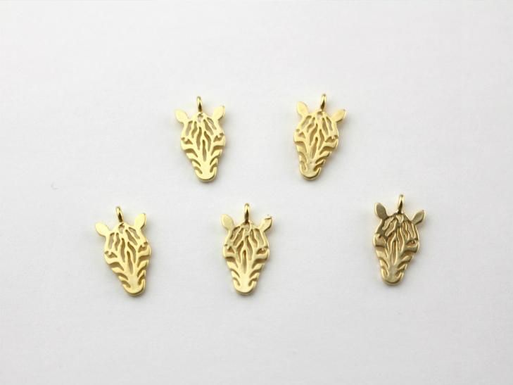 人気のサファリやアニマルデザインで個性的な作品を作っちゃおう♪珍しいシマウマの顔がモチーフになった透かしチャームです!ゼブラ柄のアイテムと一緒に使うのもおススメ★縦カン付きなので、そのままヒモやチェーンに通してトップチャームにすれば、ハンドメイド初心者さんも簡単にネックレスやブレスレット、ピアスなどに可愛くアレンジできちゃいます。※同じ商品でも入荷時期・ロット等により、サイズ・色調・メッキ等の仕様に若干の変更・個体差がある場合がございます。※細かな擦り傷などのダメージがある商品が入ることがあります。※照明・モニターの関係上、多少お色味が変わる事がございます。【内容詳細】しまうまの顔 透かしチャーム 5個【サイズ】約14.6x8mm(カン含む) カン内径:1.3mm 厚さ:1mm【カラー】マットゴールド(つや消し)/金【素材】真鍮(ブラス)※真鍮は柔らかく耐久性に優れた金属です。多少曲がっている場合がございますが戻してご使用いただけます。紗や工房のパーツは商用利用が可能です♪ぜひ素敵なアクセサリーに加工して販売してください♪