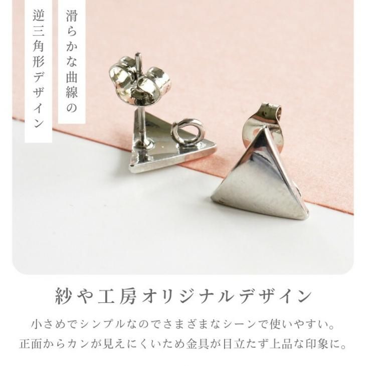 紗や工房オリジナルデザインのピアスパーツが登場!滑らかな曲線の逆三角形なのでそのままでもオシャレ♪小さめでシンプルなデザインなので上品な作品にも!裏面には開閉式のカンが付いているのでお好きなチャームやパールを付けてオリジナルデザインに!手作りハンドメイドピアスを楽しもう!※同じ商品でも入荷時期等により、サイズ・色調・メッキ等の仕様に若干の変更・個体差がある場合がございます。※細かな擦り傷などのダメージがある商品が入ることがあります。※照明・モニターの関係上、多少お色味が変わる事がございます。紗や工房のパーツは商用利用が可能です♪ぜひ素敵なアクセサリーに加工して販売してください♪【内容詳細】ピアス サージカルステンレス トライアングル 三角形 シルバー 1ペア カン付【サイズ】約9mm×10mm カン 内径:約2mm 厚さ:約1.3mm 約20ゲージ【カラー】シルバー【素材】真鍮 316Lステンレスピン【メッキ】ニッケルフリー 変色防止加工済み