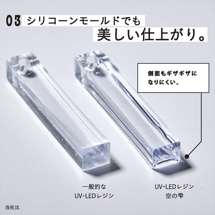 サラサラとした低粘性の1液性UV-LEDレジン。気泡抜けが良く、シリコーン型でもガラスのような透明感。特長■粘性の低いサラサラなレジン液なので、気泡も除去しやすい。■硬い仕上がり※でキズに強い。※照射直後は柔軟性がありますが、熱が取れて硬化反応が終わると硬く仕上がります。■硬化による歪みが少なく、ガラスのような透明感。■シリコーン型でもギザギザになりにくく、きれいな仕上がり。■硬化後のベタつきがない。■硬化後、時間が経っても黄変しにくい。※経年劣化による樹脂特有の変色が起こる場合があります■反りにくく、密着性が良い。硬化反応● スピード硬化UV-LEDライト、UVライト、太陽光● 硬化反応あり蛍光灯、窓際(日陰)● 硬化しない家庭用LED照明硬化時間裏表の両面照射してください。● UV-LEDライト(6W?10W) 各1〜4分● UVライト(36W) 各2?5分● 太陽光(晴天時) 各1?3分● 太陽光(雲天時) 各10?20分※作品の厚みや季節により異なります。向いている作品■シリコーンモールドをはじめとする、モールドを使用した作品■透明度が高いので、シールやパーツ等を封入してもクリアに見えます。■反りにくいので、薄くて大きいプレート制作もおすすめ。■セッティングやデコ土台に密着しやすい。■サラサラなので小さくて細かいモールドにもおすすめ。サラサラで気泡が出来にくい&除去しやすいので、レジンが初めての方からレジン作家まで幅広くご使用いただけます。※こちらの商品はメーカー取り寄せのため、在庫がない場合はご注文確認後メールにてお知らせいたします。予めご了承の上ご注文ください。※こちらの商品は海外発送を行うことができません。ご注意■ベタつきが無くなるまで、両面しっかりと照射して完全に硬化させてください。■本品は、部屋の蛍光灯や窓際(日陰)でもゆるやかに硬化反応が始まります。■本品を出した状態で長時間放置しないようご注意ください。■肌の弱い方や注意が必要な環境で作業を行う方は、手袋やメガネなどをして 作業することをおすすめします。■使用中や硬化時は必ず換気を行ってください。■硬化中は高温になります。皮膚に付着させないようご注意ください。【内容詳細】パジコ 空の雫 クリア 500g 【サイズ】ボトルサイズ:φ66mm×H226mm【カラー】クリア【素材】アクリル系光硬化樹脂【メッキ】