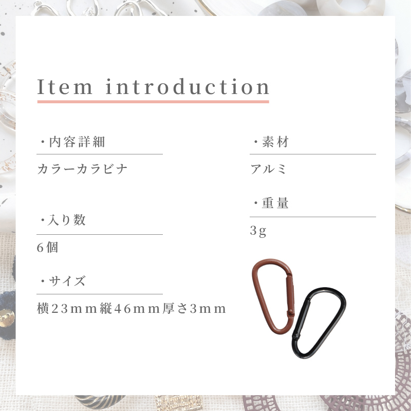 キーホルダーやストラップ製作に欠かすことのできないシンプルで使いやすいカラビナです。※同じ商品でも入荷時期等により、サイズ・色調・メッキ等の仕様に若干の変更・個体差がある場合がございます。※細かな擦り傷などのダメージがある商品が入ることがあります。※照明・モニターの関係上、多少お色味が変わる事がございます。【内容詳細】カラビナ 6個 【サイズ】全長:約46×23mm 厚み:約3mm【カラー】ブラック ブラウン ベージュ【素材】アルミ