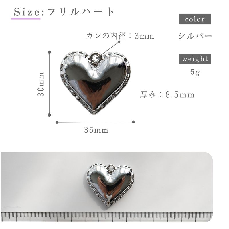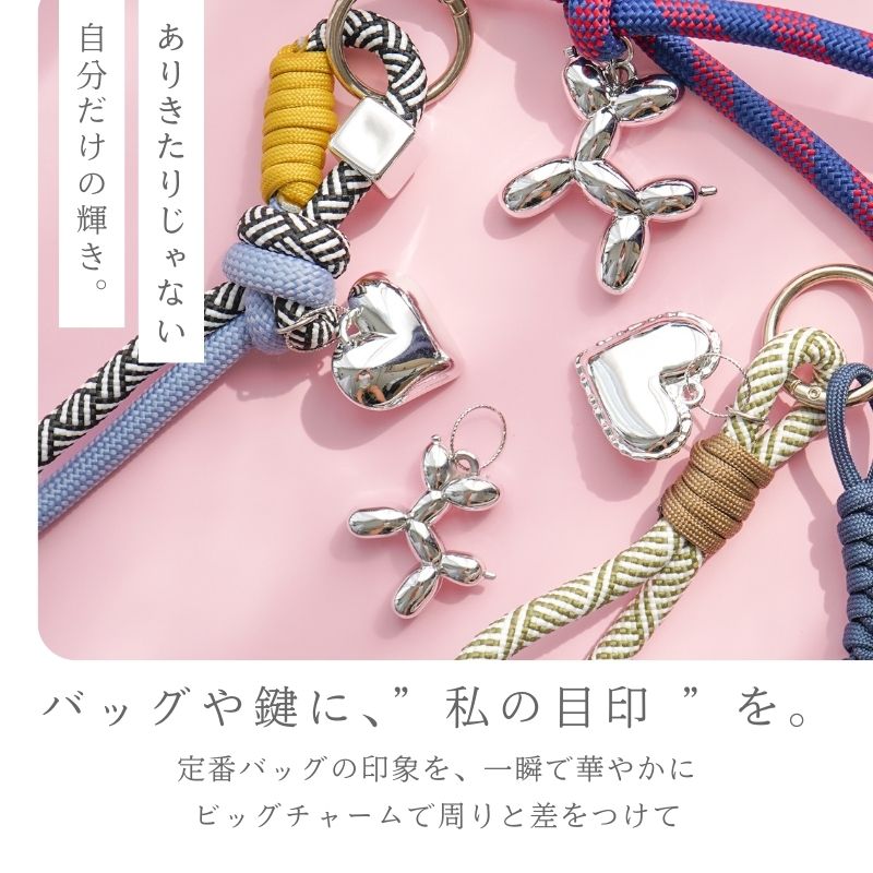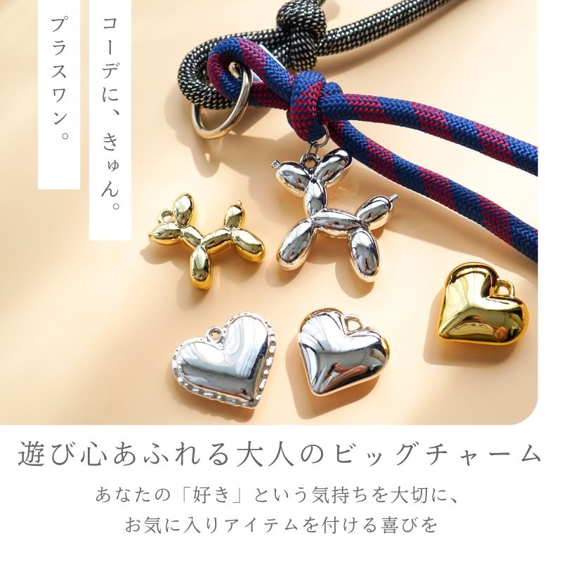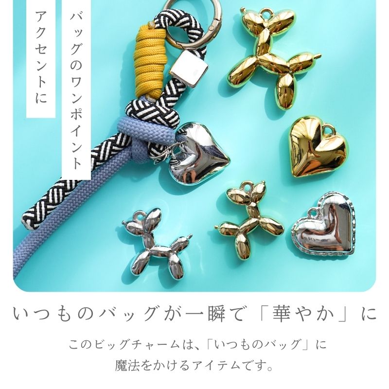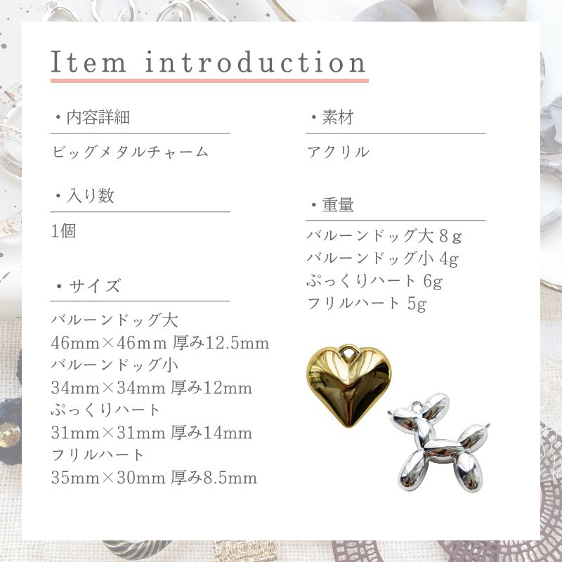 大きめサイズで存在感のあるビッグサイズのメタルチャーム。スマホショルダーやストラップ、バッグチャームにつけると作品のアクセントになってくれるので、他の人とかぶらないオリジナリティのある雰囲気作りにオススメです!※同じ商品でも入荷時期等により、サイズ・色調・メッキ等の仕様に若干の変更・個体差がある場合がございます。※細かな擦り傷などのダメージがある商品が入ることがあります。※照明・モニターの関係上、多少お色味が変わる事がございます。【内容詳細】ビッグメタルチャーム 1個 【サイズ】バルーンドッグ小:約34mm×34mm 厚み:約12mm カンの内径:約3mmバルーンドッグ大:約46mm×46mm 厚み:約12.5mm カンの内径:約3mmぷっくりハート:約31mm×31mm 厚み:約14mm カンの内径:約3mmフリルハート:約35mm×30mm 厚み:約8.5mm カンの内径:約3mm【カラー】シルバー【素材】アクリル