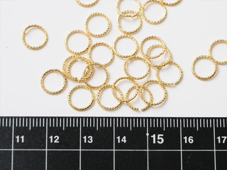 キラキラ輝くデザインカットが目を惹くのデザイン丸カン!お気に入りのチャームやビーズを繋げる接続金具もこのリングを使えば一気におしゃれに♪ニッケルフリーでアレルギー対応なのも嬉しいポイント!※普通の丸カンに比べてデザインが施されている為、数回開閉を繰り返しますとどうしても構造上割れやすくなっております。開閉の回数や開き具合を最小限にしたり、普通の丸カンと一緒に使う等してのご使用をおすすめします。※切れ目/継ぎ目がつながった商品が入ることがあります。※同じ商品でも入荷時期等により、サイズ・色調・メッキ等の仕様に若干の変更・個体差がある場合がございます。※細かな擦り傷などのダメージがある商品が入ることがあります。※照明・モニターの関係上、多少お色味が変わる事がございます。【内容詳細】デザイン丸カン ニッケルフリー 変退色防止加工済 約25個【サイズ】直径8mm 線径0.8mm【カラー】ゴールド/金【メッキ】ニッケルフリー 変退色防止加工済【素材】真鍮50個入りはこちら!【少量お試し】形、カラーなどバリエーションで購入したい方はこちら!【おまとめ買い】形、カラーなどバリエーションで購入したい方はこちら!その他デザイン丸カンはこちらから!紗や工房のパーツは商用利用が可能です♪ぜひ素敵なアクセサリーに加工して販売してください♪