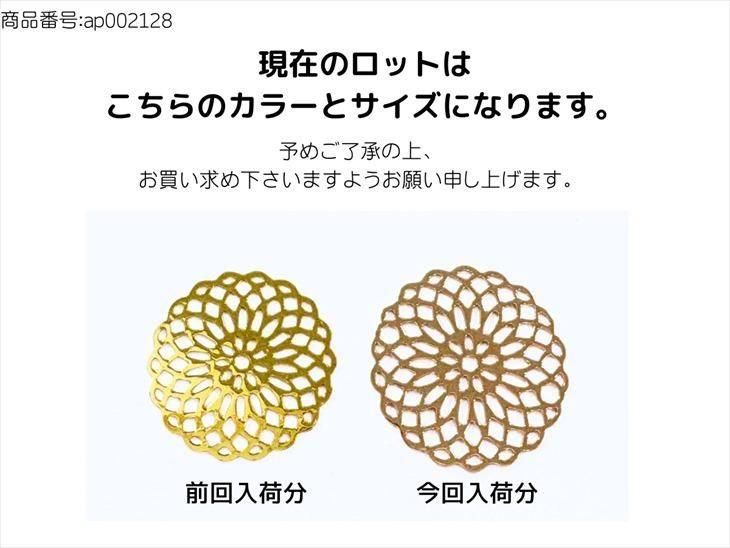 ビーズ手芸・デコ・レジンアクセサリーの主役になること間違いなしの大きめモチーフ!大輪の花のような華やかな印象のスカシパーツ☆ピアス・イヤリング金具やシルクリボン・チェーンに取り付けるだけで可愛いオリジナルアクセサリーが簡単に手作りできちゃいます。ネックレス・ブレスレットだけでなくキーホルダー・ストラップなどアレンジは自由自在♪ラインストーン・天然石などのジュエリーパーツを縫い付けて、立体的で豪華なデザインのブローチ・指輪・ヘアアクセサリーにも挑戦したいですね。あなただけの作り方・使い方レシピでハンドメイドを楽しんでください!※同じ商品でも入荷時期等により、サイズ・色調・メッキ等の仕様に若干の変更・個体差がある場合がございます。※細かな擦り傷などのダメージ・バリがある商品が入ることがあります。※照明・モニターの関係上、多少お色味が変わる事がございます。【内容詳細】透かしチャーム ラウンド/丸型 フラワー/花 約5個【サイズ】約20mmx20mm 厚さ:約0.4mm【カラー】ゴールド/金紗や工房のパーツは商用利用が可能です♪ぜひ素敵なアクセサリーに加工して販売してください♪